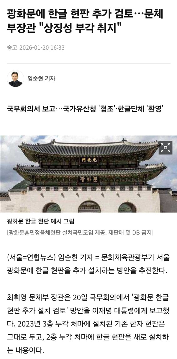 이번에 새로 부임한 국가유산청장은 이를 적극 지지하고 있으며, 문화체육관광부도 "상징성 부각 취지"에서 한글 현판 추가를 직접 추진하고 있음