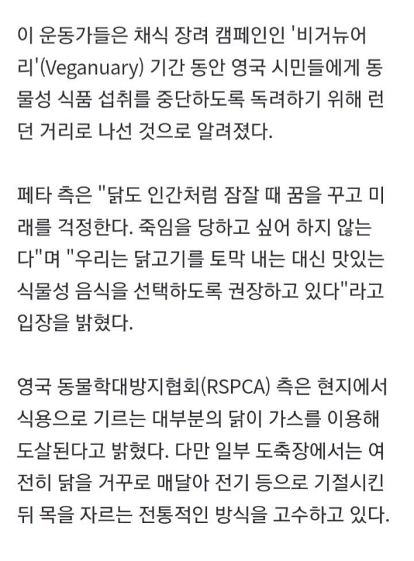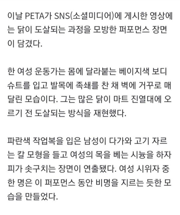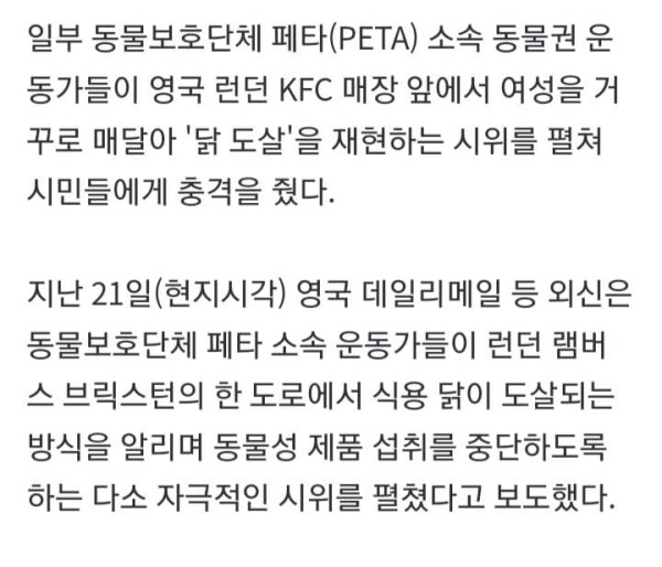 일부 동물보호단체 페타(PETA) 소속 동물권 운동가들이 영국 런던 KFC 매장 앞에서 여성을 거꾸로 매달아 '닭 도살'을 재현하는 시위를 펼쳐 시민들에게 충격을 줬다. 지난 21일(현지시각) 영국 데일리메일 등 외
