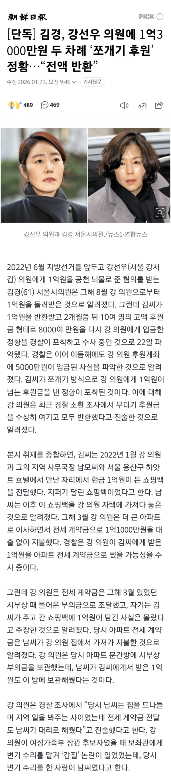 2022년 6월 지방선거를 앞두고 강선우(서울 강서갑) 의원에게 1억원을 공천 뇌물로 준 혐의를 받는 김경(61) 서울시의원은 그해 8월 강 의원으로부터 1억원을 돌려받은 것으로 알려졌다. 그런데 김씨가 1억원을 반