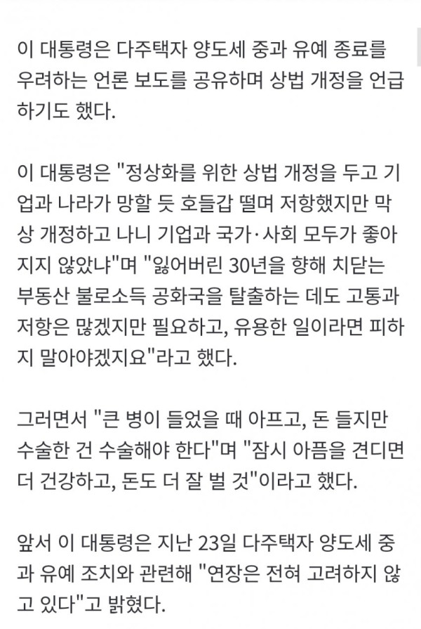 • 또한, 과거 상법 개정 당시의 저항에도 불구하고 결과적으로 모두에게 이익이 되었던 것처럼, 부동산 불로소득 공화국 탈출을 위한 이번 조치 역시 잠시 아픔을 견디면 더 건강한 경제를 만들 것이라고 덧붙였다.