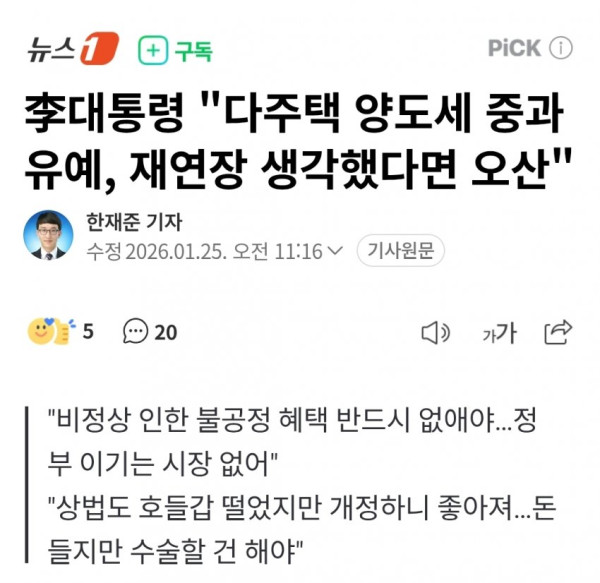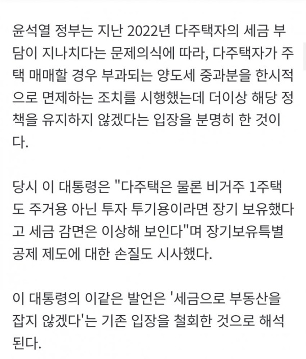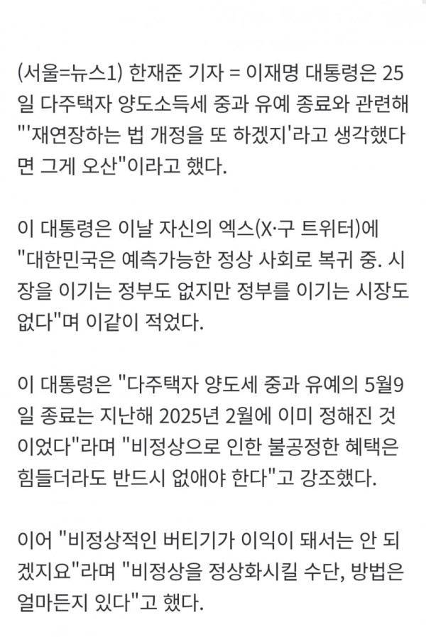 • 이재명 대통령은 다주택자 양도소득세 중과 유예 조치의 재연장 가능성에 대해 '오산'이라고 일축하며, 비정상으로 인한 불공정한 혜택은 반드시 없애야 한다고 강조했다.