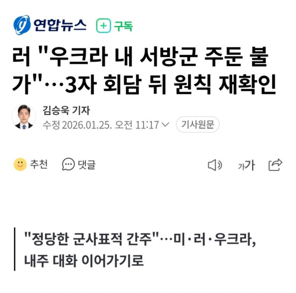 러 "우크라 내 서방군 주둔 불가"…3자 회담 뒤 원칙 재확인