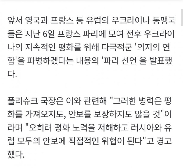 러시아, 우크라이나 내 서방군 주둔 시 '외국 개입' 간주 및 공격 경고