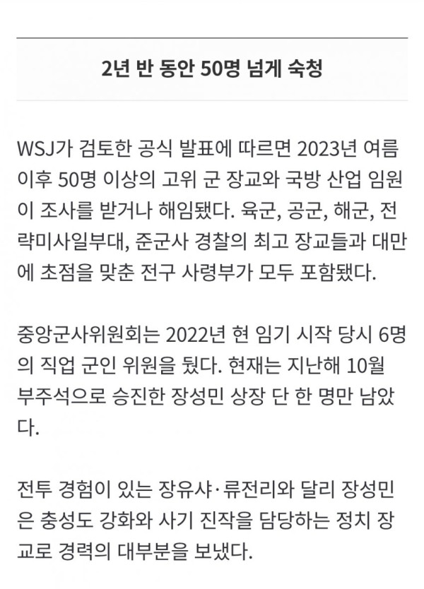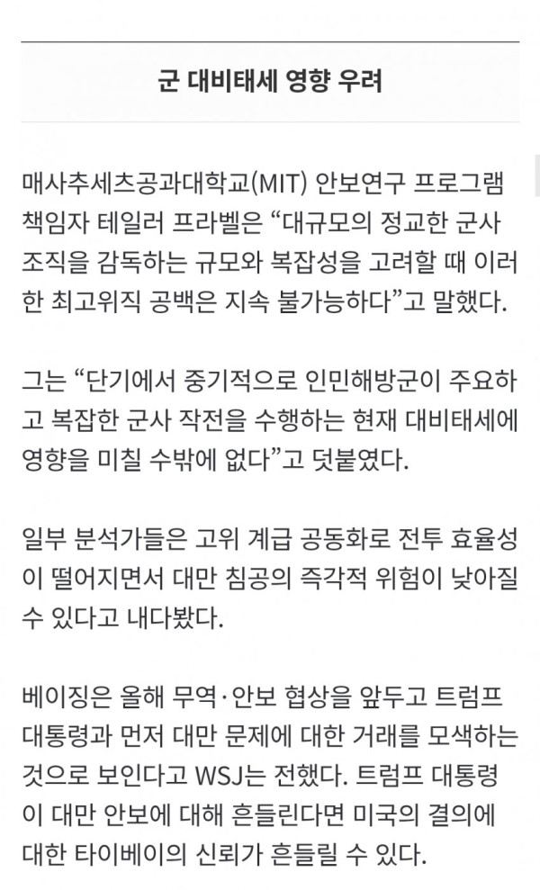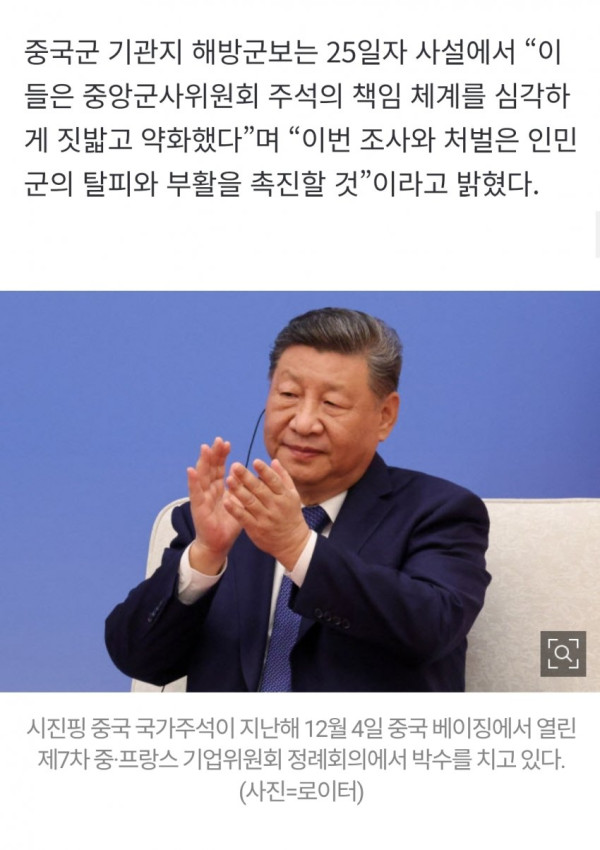 • 이번 최고위급 숙청은 중국 군사 역사상 전례 없는 일로, 시 주석의 반부패 의지가 확고함을 보여주며, 군 대비태세와 잠재적으로 대만 침공 위험에 영향을 미칠 수 있다는 분석이 나오고 있다.