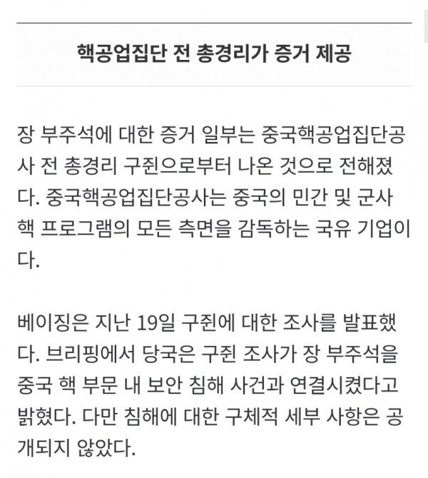 • 이번 조사에는 중국핵공업집단공사 전 총경리 구쥔의 조사 결과도 일부 포함되었으며, 이는 중국 핵 부문 내 보안 침해 사건과 장 부주석을 연결시키는 증거로 작용하고 있다.