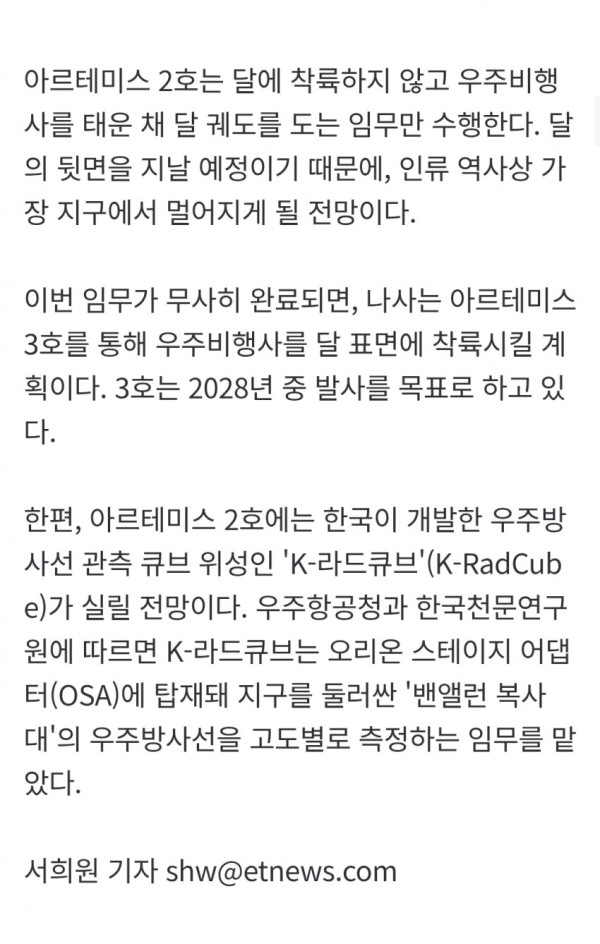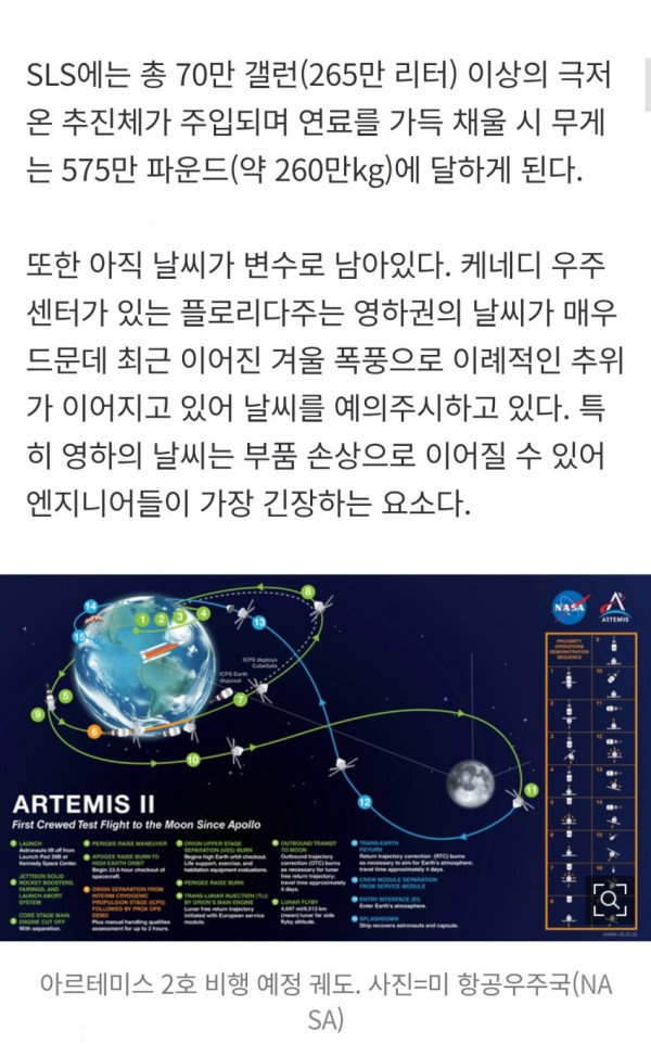 • 이번 아르테미스 2호 임무에는 한국이 개발한 우주방사선 관측 큐브 위성 'K-라드큐브'가 탑재되어 지구를 둘러싼 밴앨런 복사대의 우주방사선을 고도별로 측정하는 임무를 수행할 예정이며, NASA는 현재 플로리다 지역의 이례적인 겨울 폭풍으로 인한 저온 현상이 부품 손상으로 이어질 수 있어 날씨를 예의주시하고 있다.