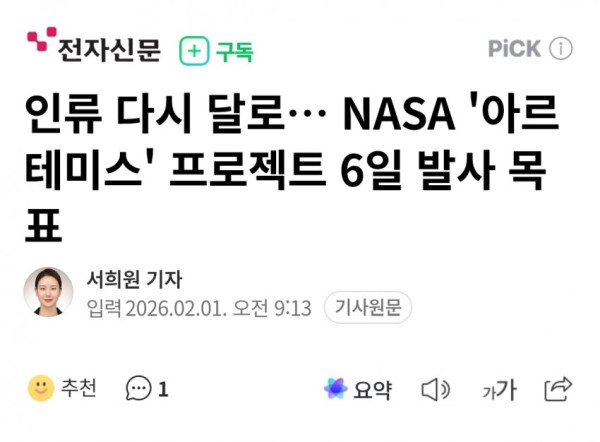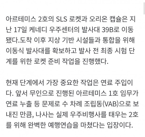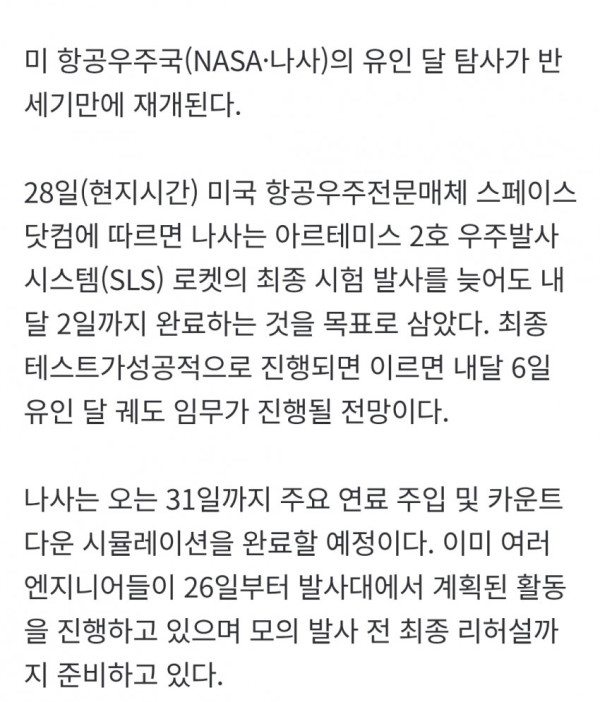 • 미 항공우주국(NASA)은 유인 달 탐사 프로젝트 '아르테미스 2호'의 최종 시험 발사를 내달 2일까지 완료하고, 성공 시 이르면 6일 유인 달 궤도 임무를 진행할 예정이며, 이를 위해 주요 연료 주입 및 카운트다운 시뮬레이션 등 최종 리허설을 준비하고 있다.