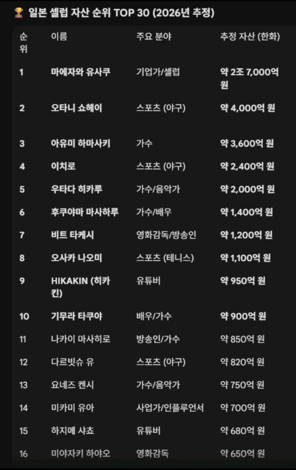의외로 세계적인 문화강국인 일본의 스타들과 자산수준이 거의 비등비등한 수준이라고함 (마에자와 유사쿠는 기업인이니 논외)