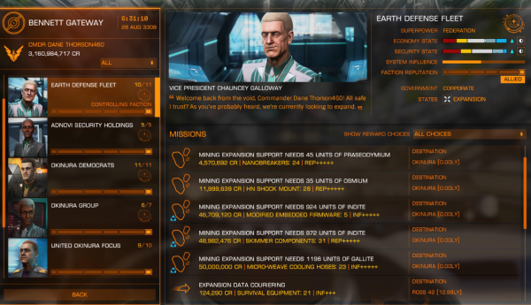 먼저 한 가지 알아두어야 할 점은 엘리트 데인저러스의 미션은 게임 내 세력들의 구도, 경제 상황 등에 따라 미션이 생성되거나 없어지는 경우가 있었다