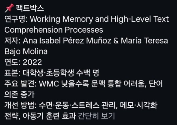 작업 기억이 낮은 사람은, 맥락을 긴 단위로 기억하지 못해 문단이 말하고자 하는 것을 부정확하게 읽어낼 가능성이 존재한다는 것이다