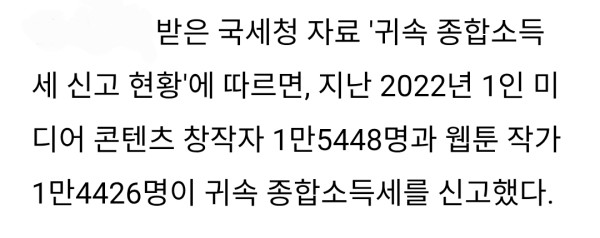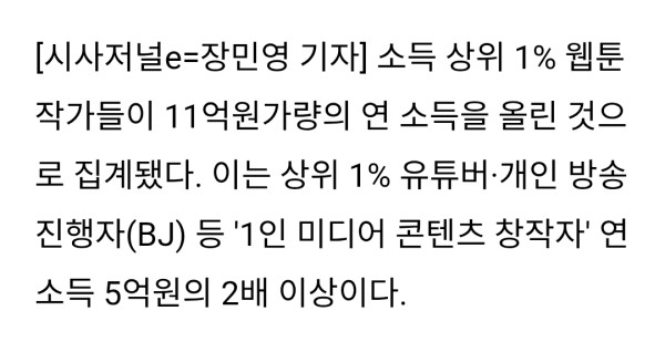 미디어 창작자(유튜버, bj) 연소득 상위 1%