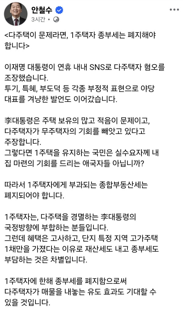안철수 국민의힘 의원이 “1주택자는 다주택을 경멸하는 이재명 대통령의 국정방향에 부합하는 분들”이라면서 “따라서 1주택자에게 부과되는 종합부동산세는 폐지되어야 한다”고 주장했다.