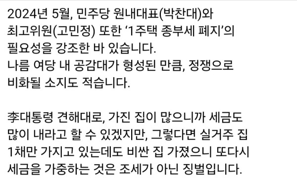 년 5월 민주당 원내대표(박찬대)와 최고위원(고민정) 또한 ‘1주택 종부세 폐지’의 필요성을 강조한 바 있다”고 덧붙였다.