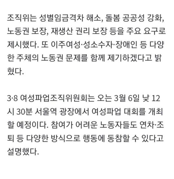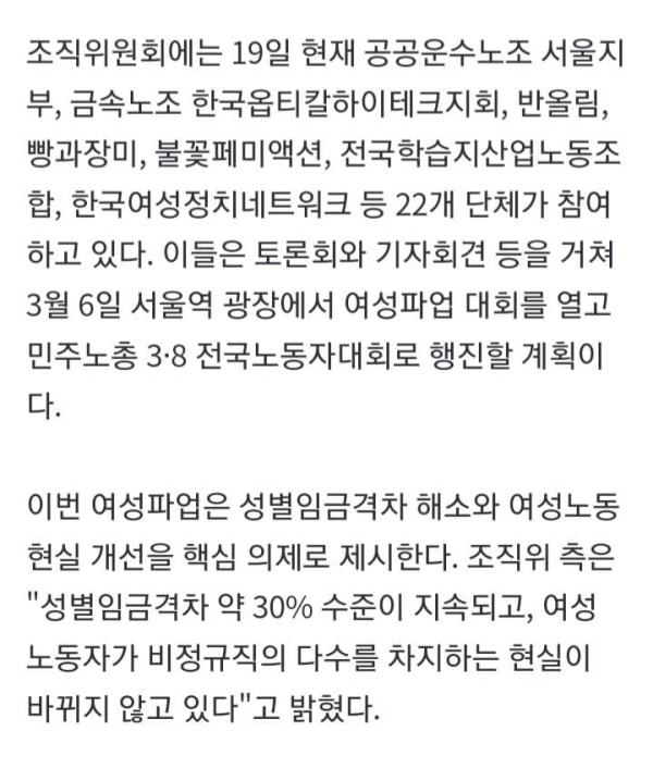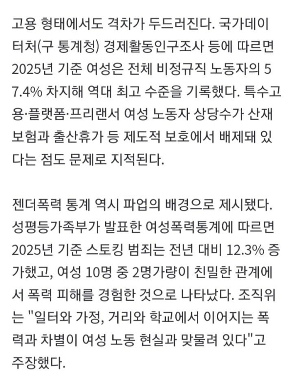 3·8 세계여성의 날을 앞두고 여성·노동·시민단체가 '2026년 3·8 여성파업조직위원회'를 꾸리고 파업을 예고했다. 성별임금격차와 여성 비정규직 집중, 증가하는 젠더폭력 통계를 근거로 구조적 성차별 현실을 사회적