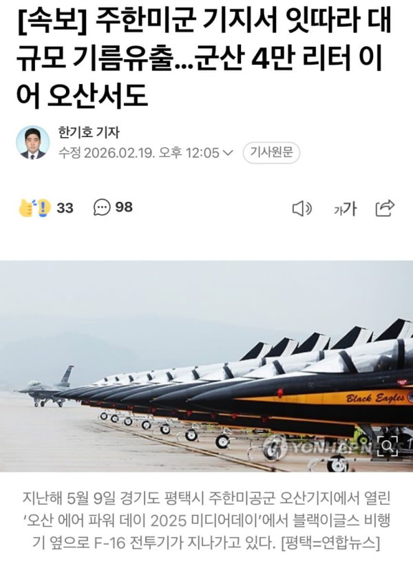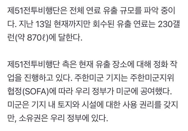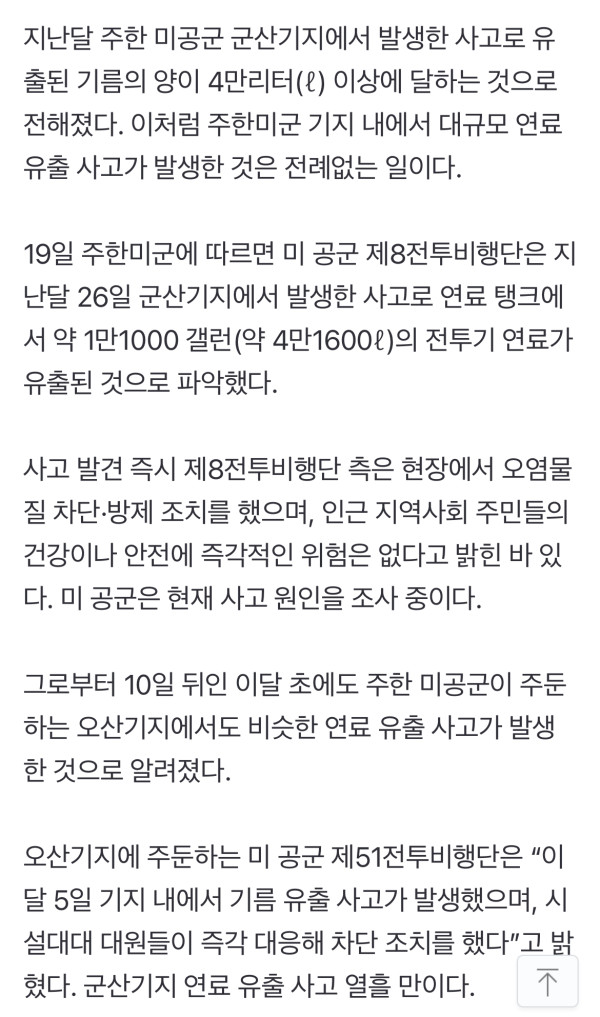 지난달 주한 미공군 군산기지에서 발생한 사고로 유출된 기름의 양이 4만리터(ℓ) 이상에 달하는 것으로 전해졌다. 이처럼 주한미군 기지 내에서 대규모 연료 유출 사고가 발생한 것은 전례없는 일이다. 19일 주한미군에