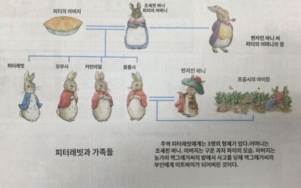 그건 바로 피터 래빗의 아버지가 작중 인간인 맥그레거 아저씨네 정원에 들어갔다 사냥당하고 파이가 되어버렸다는 것...