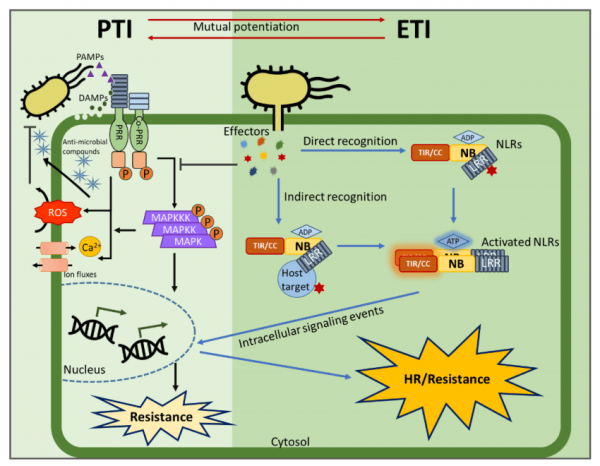 NLR이 효과기 활동을 감지하면 PTI를 보강하는 신호를 보내 효과기의 방해 효과를 저감시키고, PTI도 ETI의 상승을 유도한다.