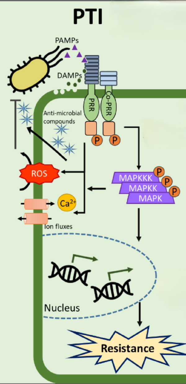 병원체가 감염을 시도한다면, 식물은 세포막 표면에 있는 패턴 인식 수용체(Pattern Recognition Receptor, PRR)를 통해 PAMP를 감지한다.