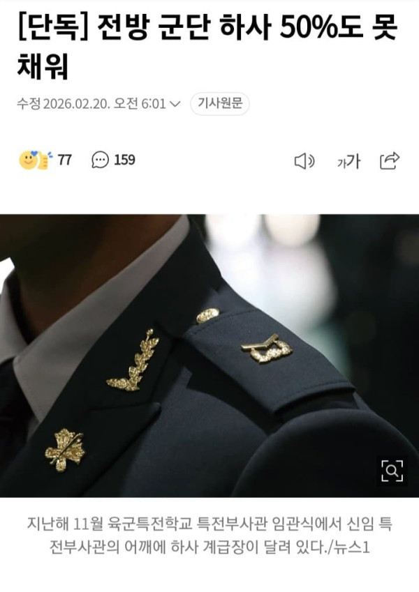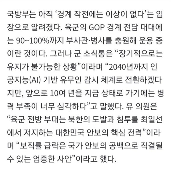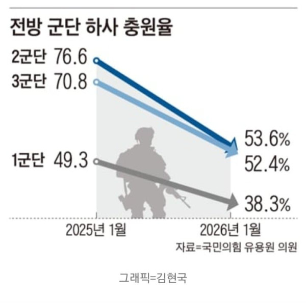 유사시 대북 방어의 핵심 역할을 해야 할 육군 전방 군단들이 하사 보직을 절반 정도밖에 충원하지 못하고 있는 것으로 나타났다. 1군단의 하사 보직 충원율(보직률)은 38.3%까지 떨어졌다. 최근 수년간 군이 부사관