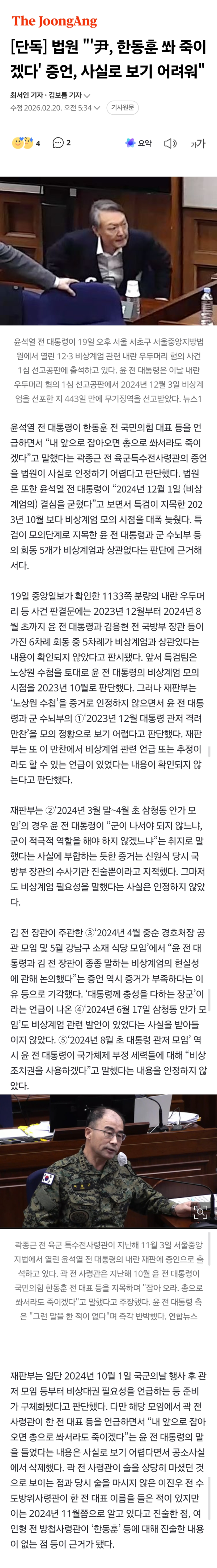 법원 "'尹 한동훈 쏴죽이겠다' 증언 사실로 보기 어려워"