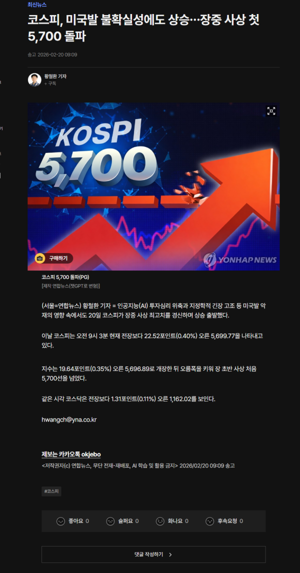 코스피, 미국발 불확실성에도 상승…장중 사상 첫 5,700 돌파 | 연합뉴스