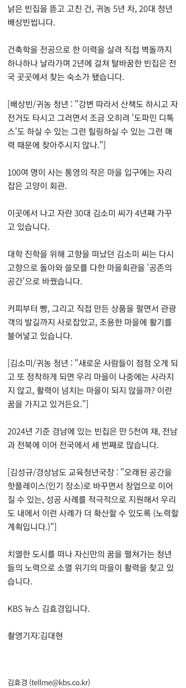 [앵커] 낡고 방치된 빈집은 농촌과 어촌 지역의 큰 문제로 지적되는데요. 낡은 건물을 고치고 활력을 불어넣으면서 빈집뿐 아니라 마을까지 되살리고 있는 청년들을 김효경 기자가 만났습니다. [리포트] 1년 넘게 아무도