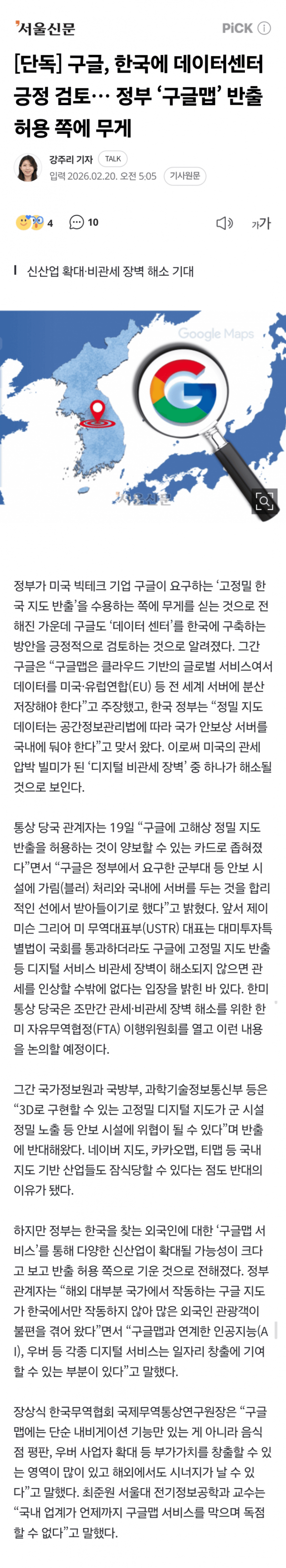 ) 등 전 세계 서버에 분산 저장해야 한다”고 주장했고, 한국 정부는 “정밀 지도 데이터는 공간정보관리법에 따라 국가 안보상 서버를 국내에 둬야 한다”고 맞서 왔다. 이로써 미국의 관세 압박 빌미가 된 ‘디지털 비관세 장벽’ 중 하나가 해소될 것으로 보인다.
