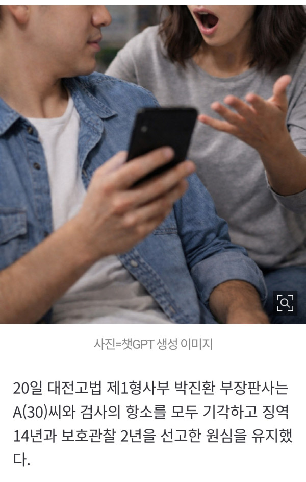 성관계 불법 촬영 영상을 신고하겠다는 여자친구를 살해한 혐의(살인)로 재판에 넘겨진 30대가 항소심에서 징역 14년을 선고받았다. 사진=챗GPT 생성 이미지 20일 대전고법 제1형사부 박진환 부장판사는 A(30)씨와