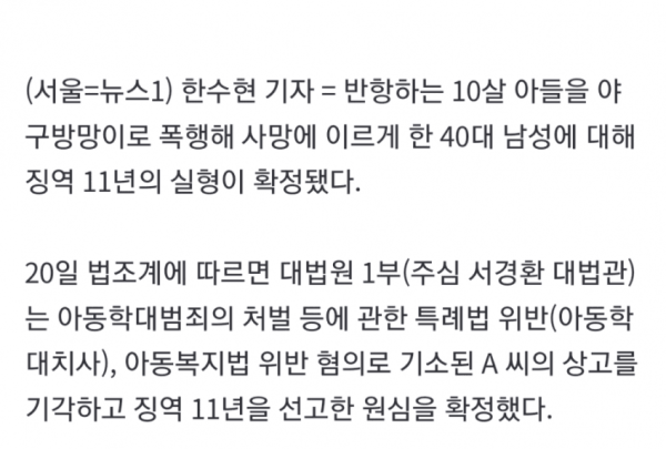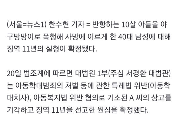 반항하는 10살 아들을 야구방망이로 폭행해 사망에 이르게 한 40대 남성에 대해 징역 11년의 실형이 확정됐다. 20일 법조계에 따르면 대법원 1부(주심 서경환 대법관)는 아동학대범죄의 처벌 등에 관한 특례법 위반(
