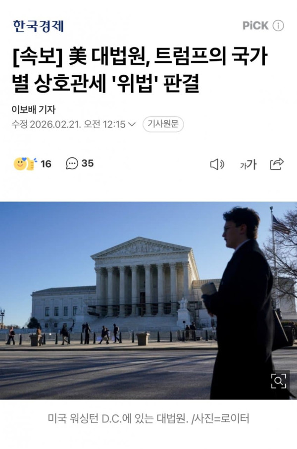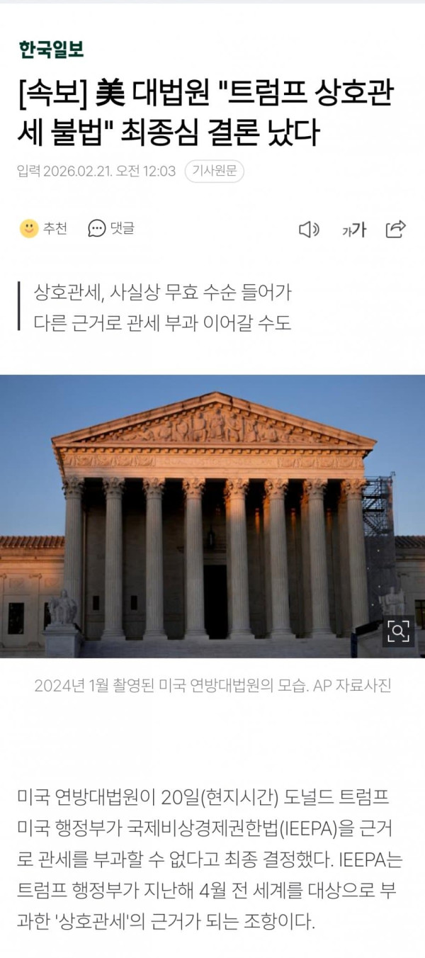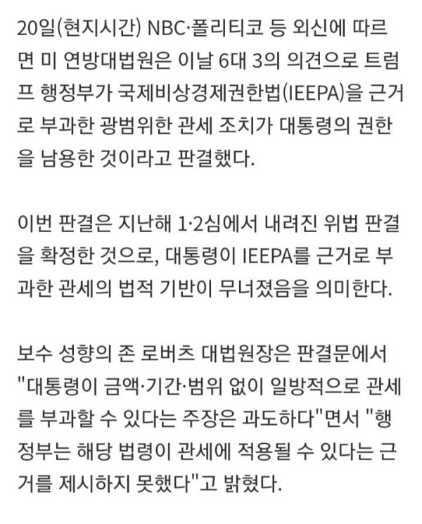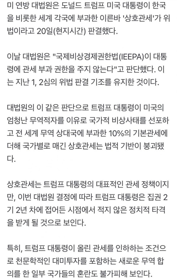 미 연방 대법원은 도널드 트럼프 미국 대통령이 한국을 비롯한 세계 각국에 부과한 이른바 '상호관세'가 위법이라고 20일(현지시간) 판결했다. 이날 대법원은 "국제비상경제권한법(IEEPA)이 대통령에 관세 부과 권한을