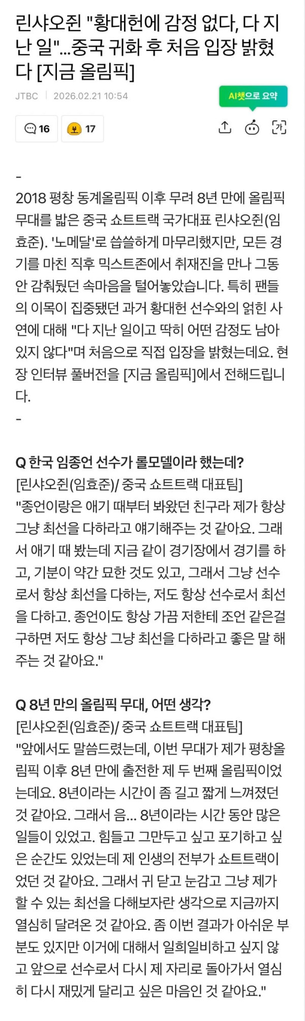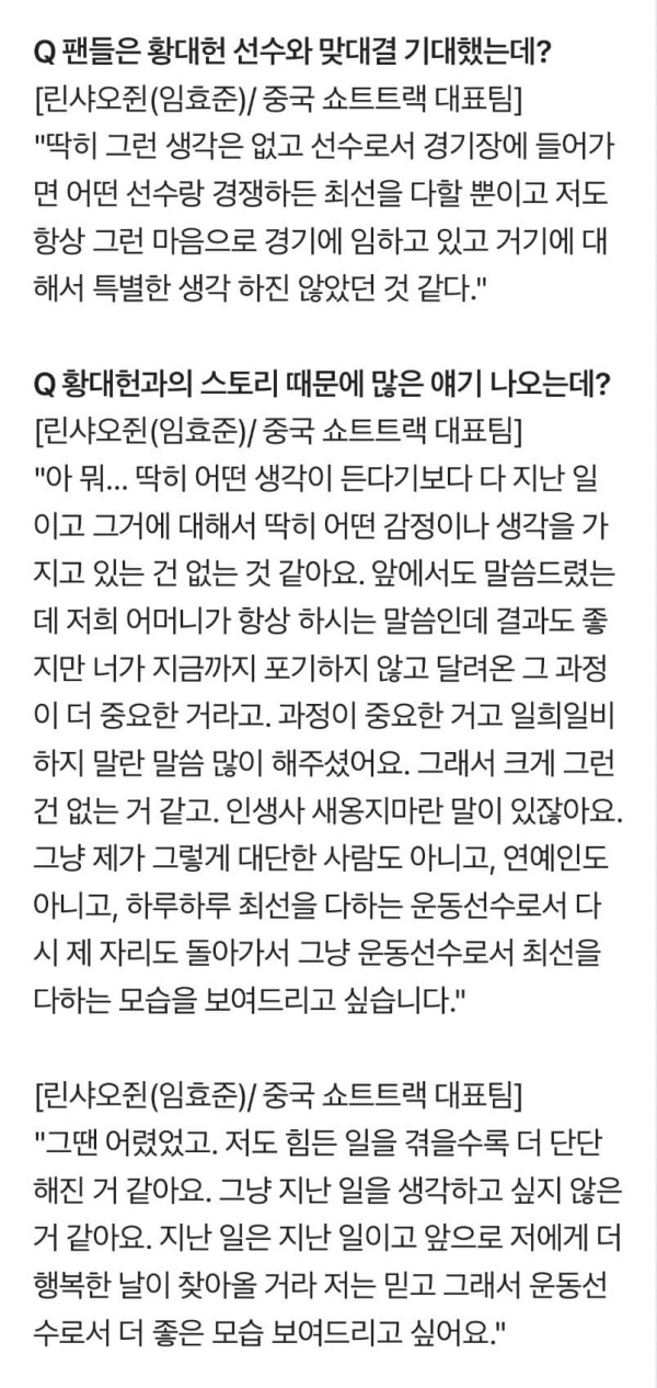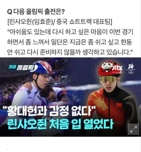 린샤오쥔 "황대헌에 감정 없다, 다 지난 일"