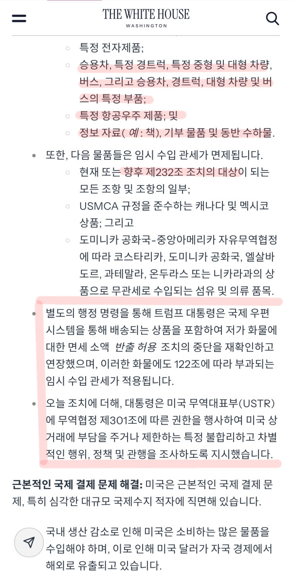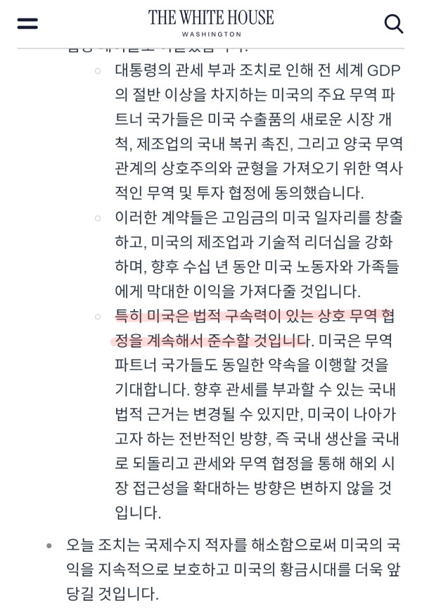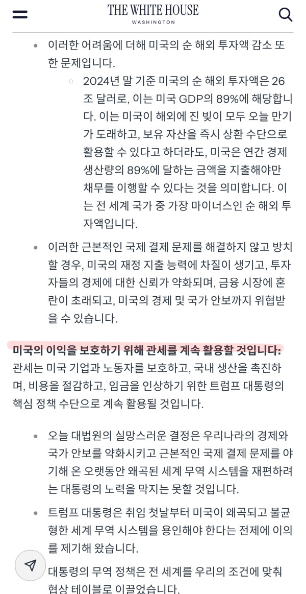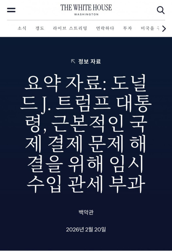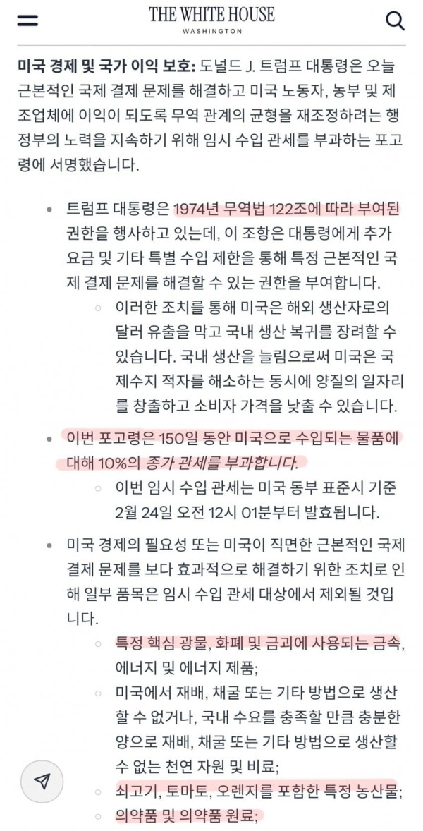 (서울=연합뉴스) 송광호 기자 = 미국 백악관은 도널드 트럼프 대통령이 대법원의 '상호관세 위법' 판결 직후 공표한 10%의 '임시 관세'가 미...