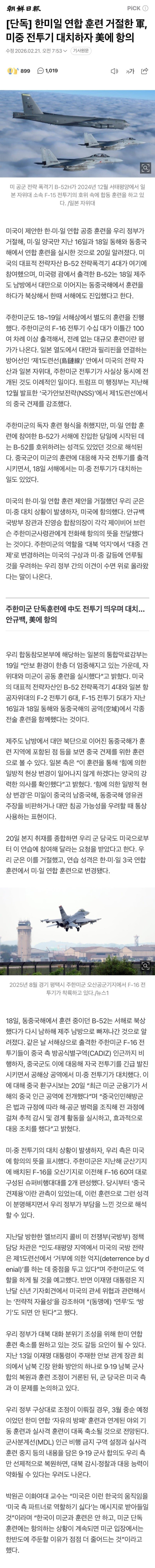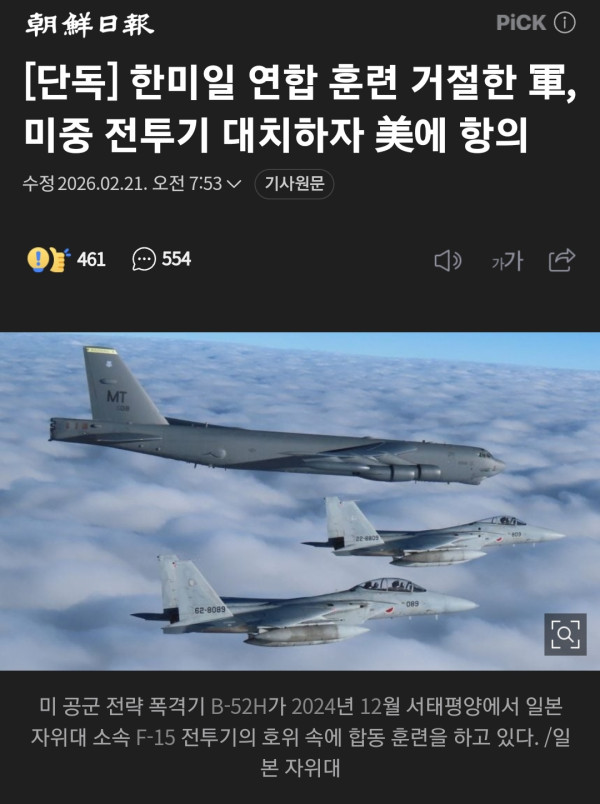미국이 제안한 한·미·일 연합 공중 훈련을 우리 정부가 거절해, 미·일 양국만 지난 16일과 18일 동해와 동중국해에서 연합 훈련을 실시한 것으로 20일 알려졌다. 미국의 대표적 전략자산 B-52 전략폭격기 4대가