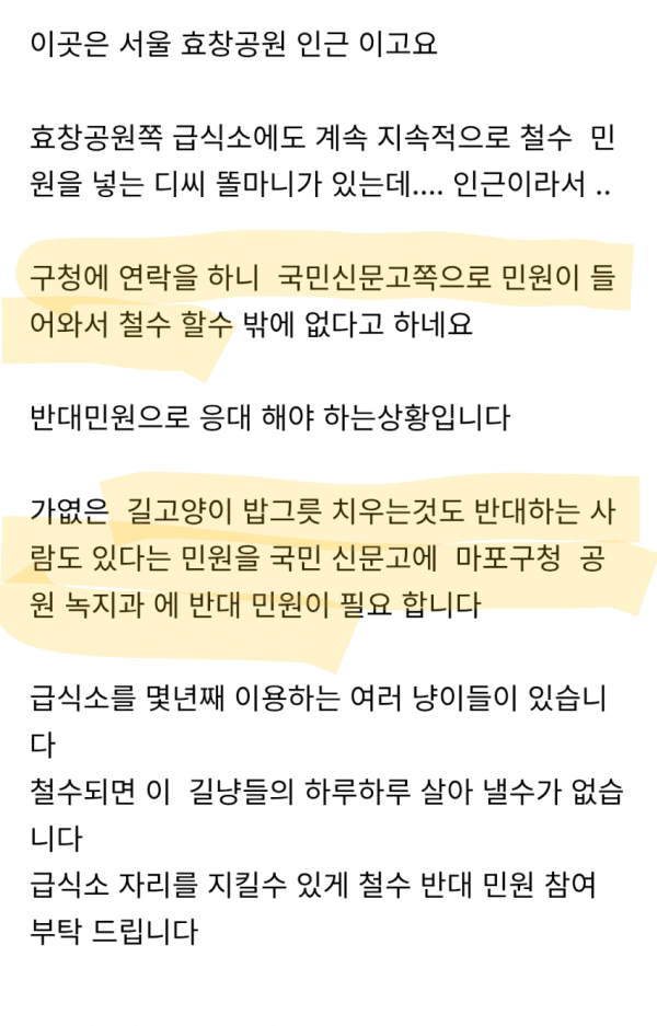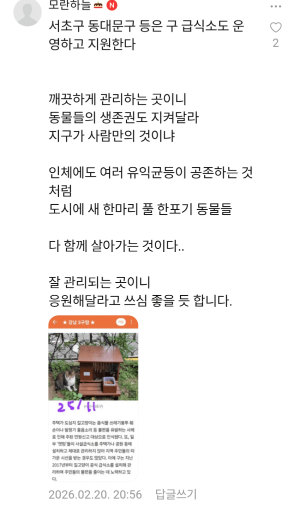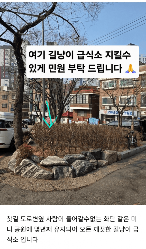 그러니까 그렇게 좋으면 단독 아파트 공동주택 실내주차장에 급식소 만들어놓고 거기다가 주던가 여기살지도않으면서 굳이 여기까지와서 사료뿌려놓고 가냐고