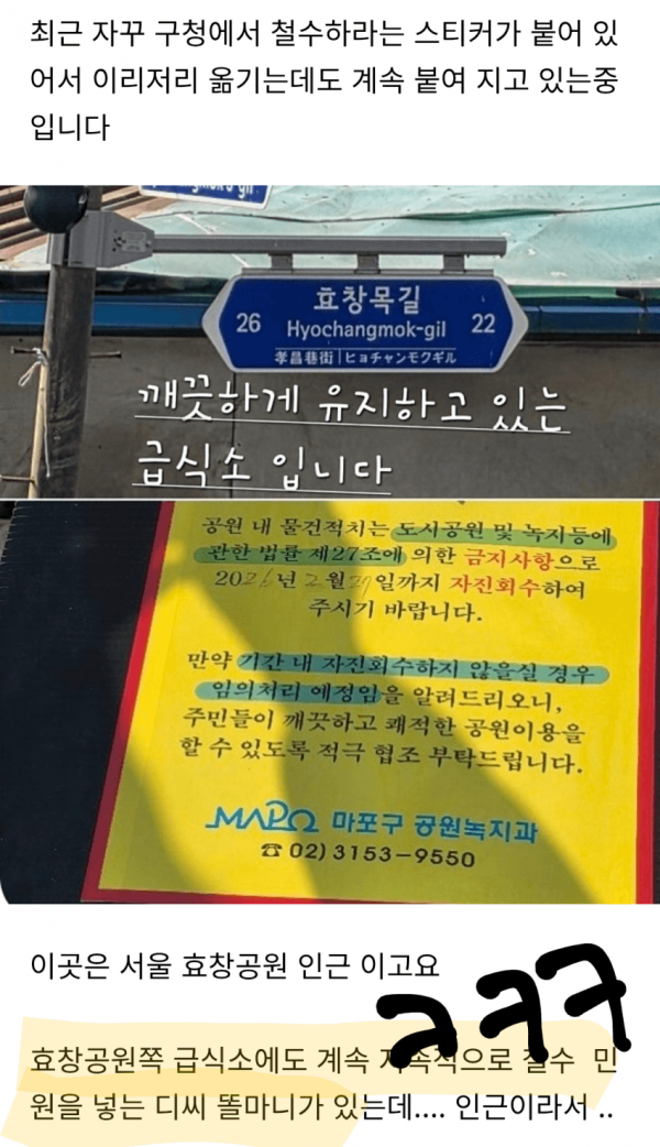 급식소 하나안만들고 남의집 남의 사유지 공유지 모퉁이에다가 죽어라 이렇게 뿌려댐 이들이 무불별하게 적치한적치물때문에 손쉽게 화재가 나고있음 그이유가 관리주체가