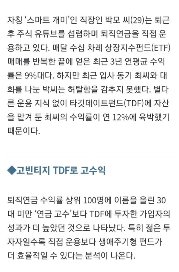 자칭 ‘스마트 개미’인 직장인 박모 씨(29)는 퇴근 후 주식 유튜브를 섭렵하며 퇴직연금을 직접 운용하고 있다. 매달 수십 차례 상장지수펀드(ETF) 매매를 반복한 끝에 얻은 최근 3년 연평균 수익률은 9%대다. 하