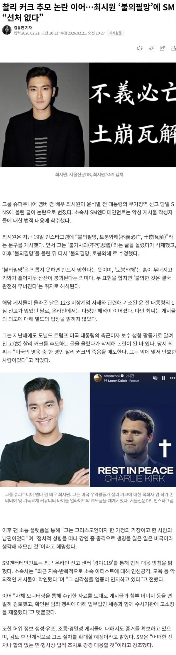 찰리 커크 추모 논란 이어…최시원 ‘불의필망’에 SM “선처 없다”