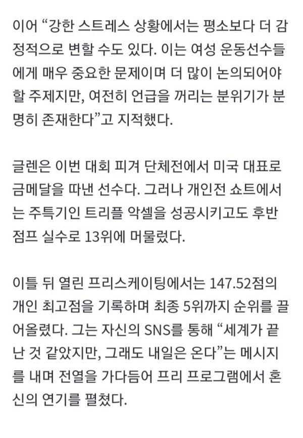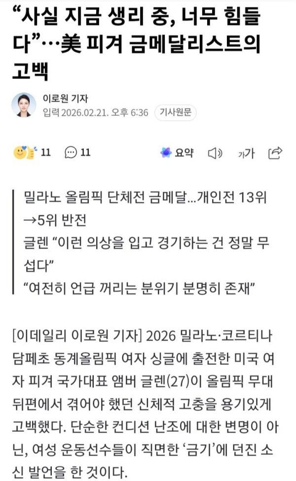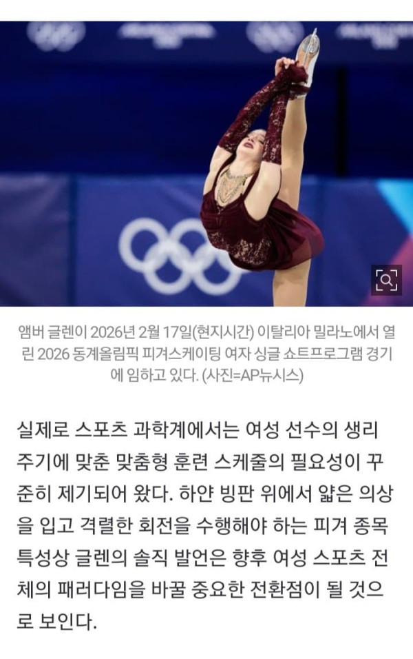 [이데일리 이로원 기자] 2026 밀라노·코르티나담페초 동계올림픽 여자 싱글에 출전한 미국 여자 피겨 국가대표 앰버 글렌(27)이 올림픽 무대 뒤편에서 겪어야 했던 신체적 고충을 용기있게 고백했다. 단순한 컨디션 난조에 대한 변명이 아닌, 여성 운동선수들이 직면한 ‘금기’에 던진 소신 발언을 한 것이다.앰버 글렌이 202...