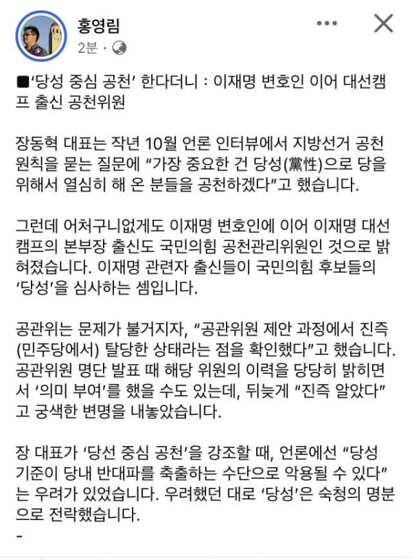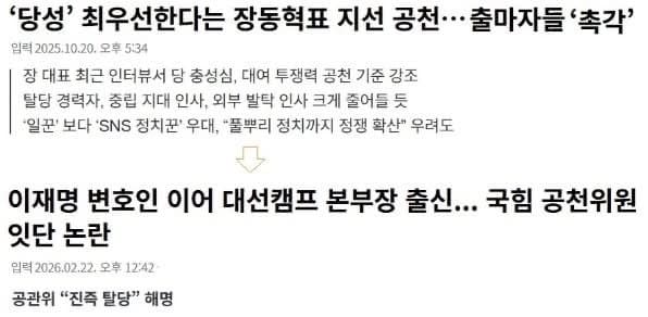 “이재명 관련자들이 국민의힘 공천까지 쥐고 흔든다”는 반발이 나오고 있는 것이다.