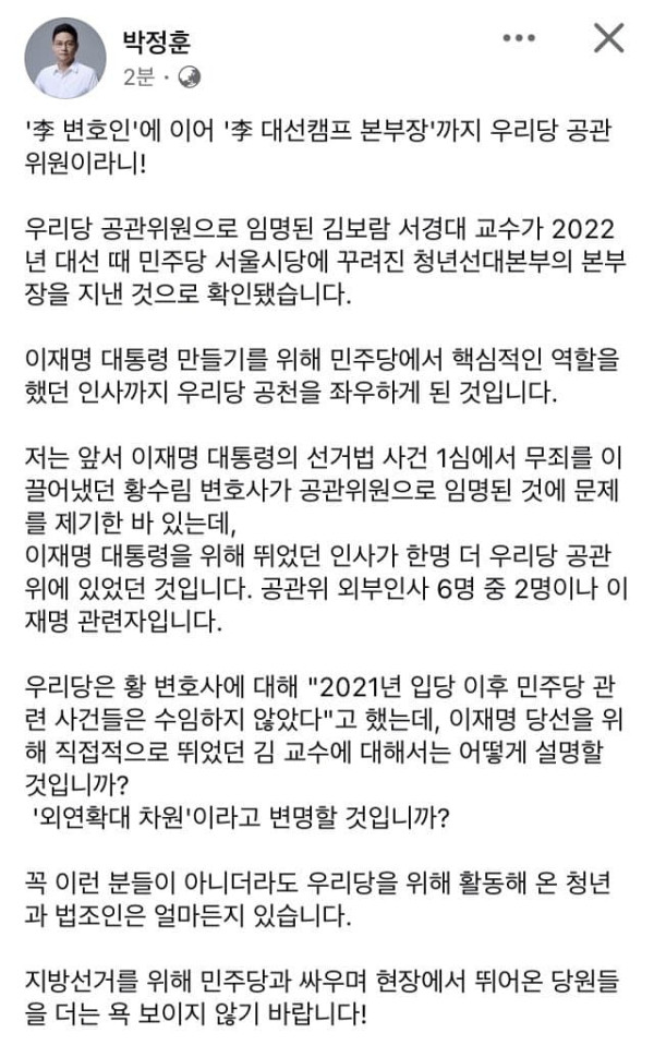 박정훈 페북업) 공관위원 김보람: 민주당 청년선대본부 본부장 출신