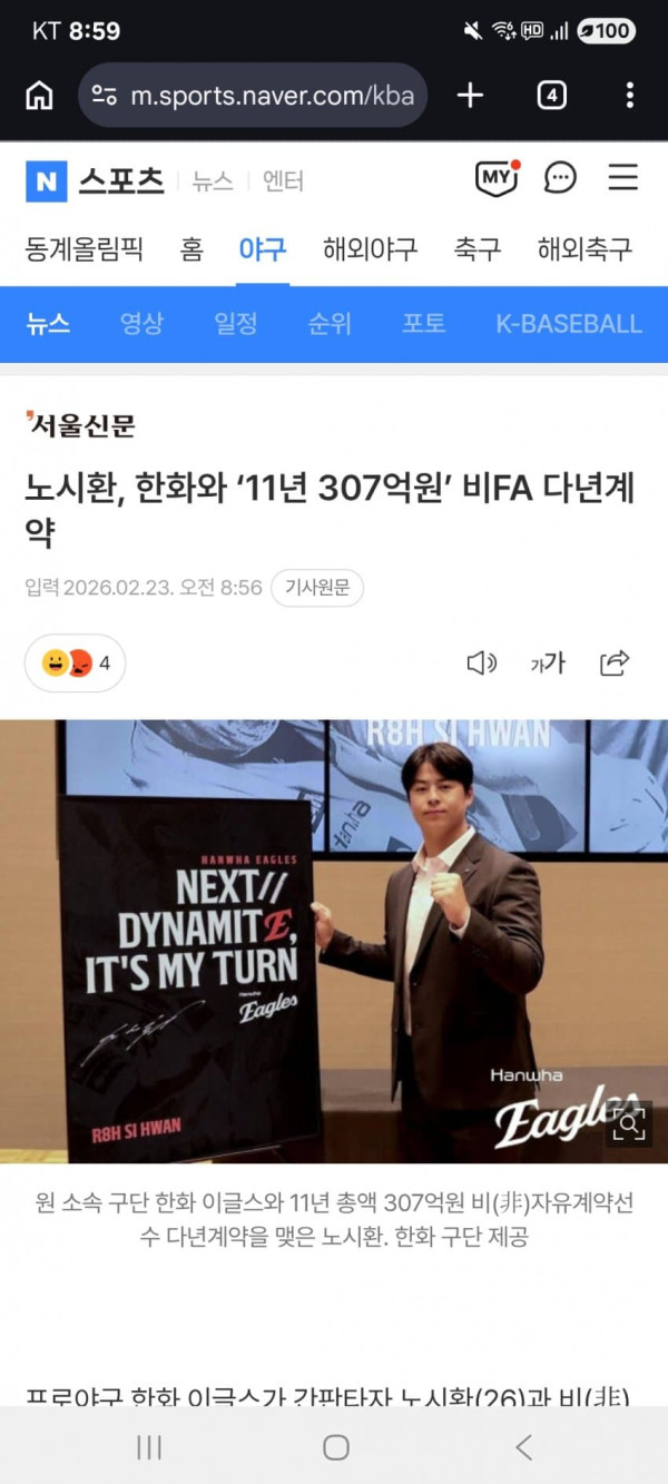한화이글스는 노시환의 과거(신인으로 입단해 프랜차이즈 스타로 성장한 과정과 상징성), 현재(KBO리그를 대표하는 거포로서 가치), 미래(아직 20대 중반의 젊은 나이에 향후 발전 가능성이 여전히 열려 있는 점)를 두루 반영해 대형 계약을 체결했다.