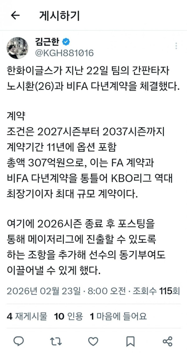 한화는 22일 노시환과 비FA 다년 계약을 체결했다고 23일 발표했다. 계약 조건은 2027시즌부터 2037시즌까지 계약기간 11년에 옵션 포함 총액 307억원으로, 이는 FA 계약과 비FA 다년계약을 통틀어 KBO리그 역대 최장기이자 최대 규모 계약이다.