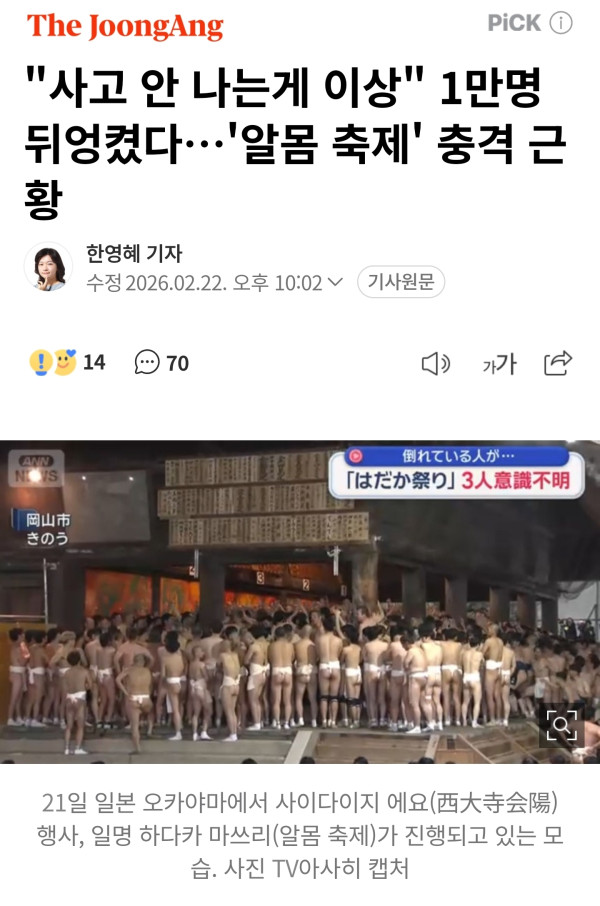 속옷 한 장 걸친 남성들이 몸싸움을 하는 일본의 ‘알몸 축제’에서 부상자가 속출했다. 일부는 현재까지 의식을 찾지 못한 가운데, 현지 경찰이 수사에 나섰다. 22일 NHK 등 현지 언론에 따르면 전날 오카야마시 외곽