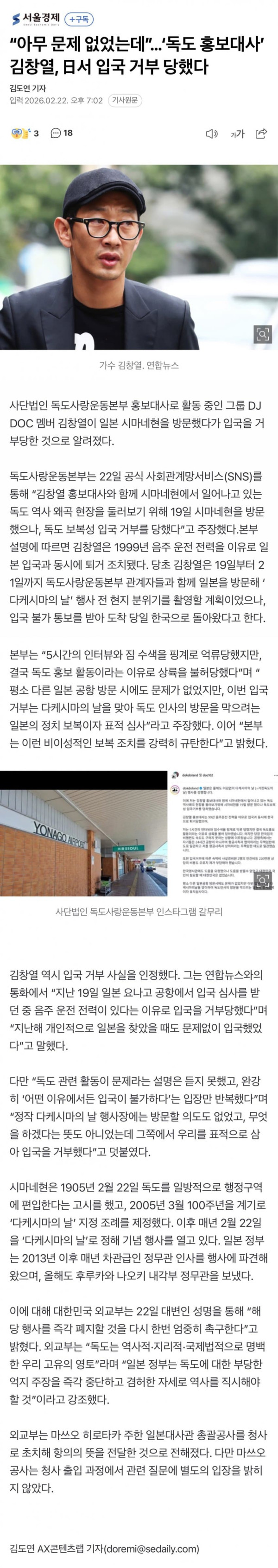 사단법인 독도사랑운동본부 홍보대사로 활동 중인 그룹 DJ DOC 멤버 김창열이 일본 시마네현을 방문했다가 입국을 거부당한 것으로 알려졌다. 독도사랑운동본부는 22일 공식 사회관계망서비스(SNS)를 통해 “김창열 홍보