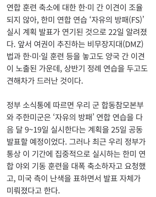 연합 훈련 축소에 대한 한·미 간 이견이 조율되지 않아, 한미 연합 연습 ‘자유의 방패(FS)’ 실시 계획 발표가 연기된 것으로 22일 알려졌다. 앞서 여권이 추진하는 비무장지대(DMZ)법과 한·미·일 훈련 등을 놓