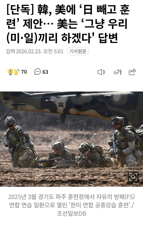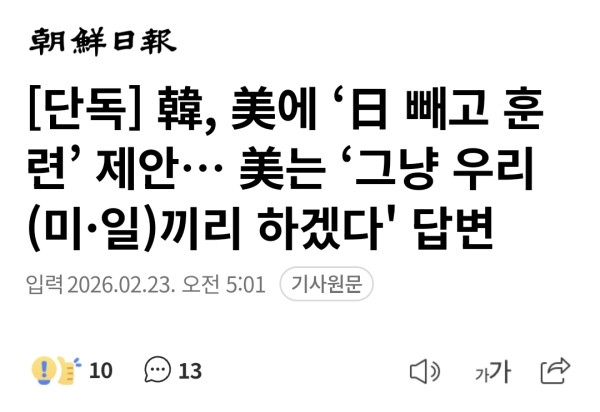[단독] 韓, 美에 ‘日 빼고 훈련’ 제안… 美는 ‘그냥 우리(미·일)끼