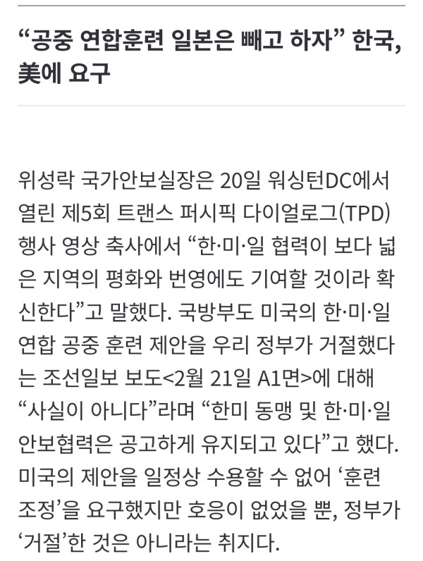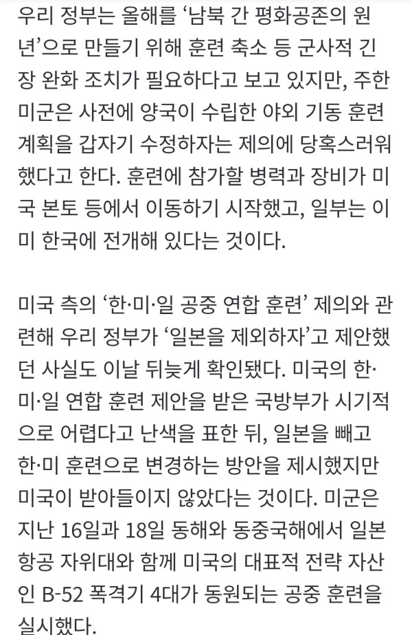 [단독] 韓, 美에 ‘日 빼고 훈련’ 제안… 美는 ‘그냥 우리(미·일)끼리 하겠다' 답변
