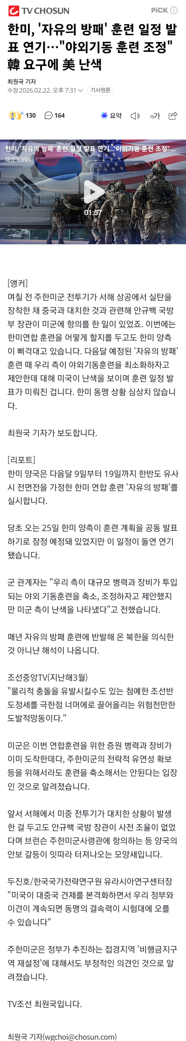 한미 자유의 방패 훈련 일정 발표연기 야외기동 훈련 조정 韓요구에 美난색