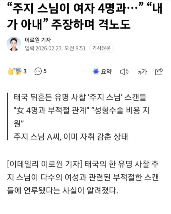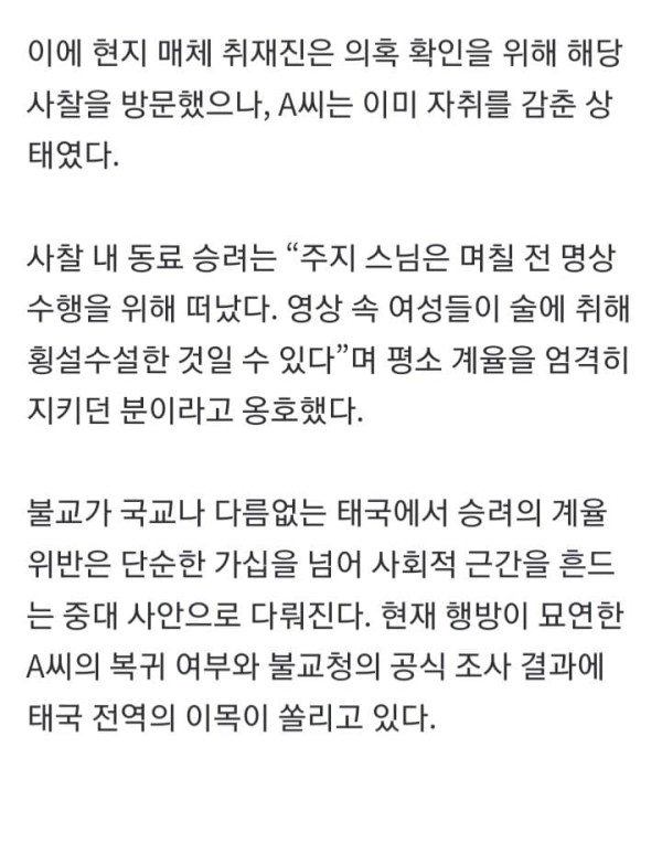태국의 한 유명 사찰 주지 스님이 다수의 여성과 관련된 부적절한 스캔들에 연루됐다는 사실이 알려졌다. 태국의 한 유명 사찰 주지 스님이 다수의 여성과 부적절한 관계를 맺고 경제적 지원까지 해왔다는 의혹이 제기돼 충격
