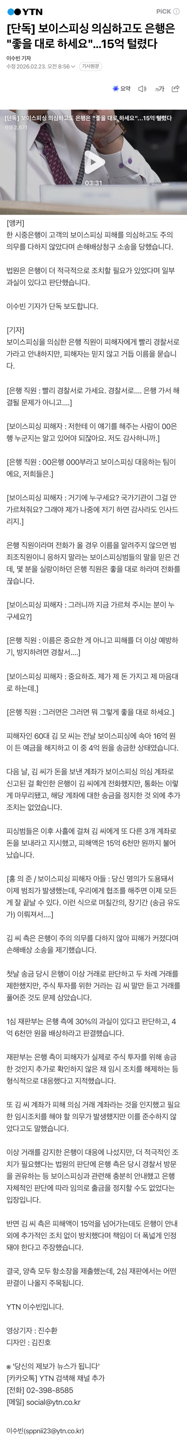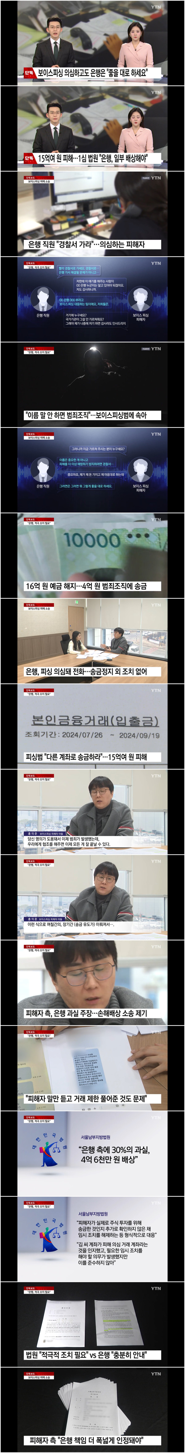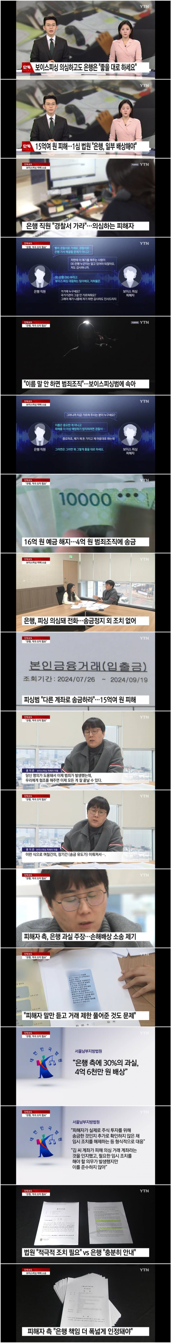 한 시중은행이 고객의 보이스피싱 피해를 의심하고도 주의 의무를 다하지 않았다며 손해배상청구 소송을 당했습니다. 법원은 은행이 더 적극적으로 조치할 필요가 있었다며 일부 과실이 있다고 판단했습니다. 이수빈 기자가 단독
